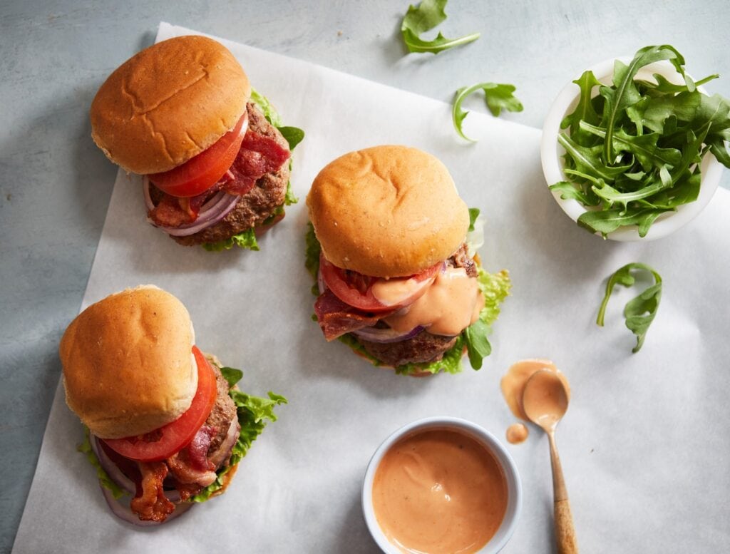 Serve each patty on bun and top with lettuce, bacon, tomato, and sliced onion.