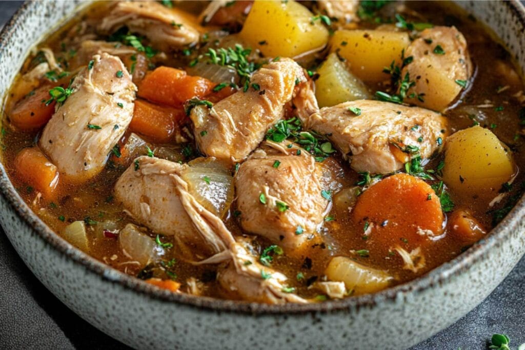 This rotisserie chicken stew uses pulled chicken with potatoes, carrots, celery, and Williams Chipotle Taco Seasoning for smoky, complex flavor that comes together in 25 minutes. All the comfort of traditional chicken stew with the convenience of store-bought rotisserie chicken. Perfect with crusty bread for dipping.